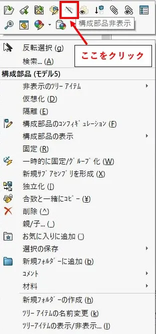 メニューが出てくるので「構成部品非表示」(目のイラストに斜線が入っているもの)をクリックすると部品が非表示になります。