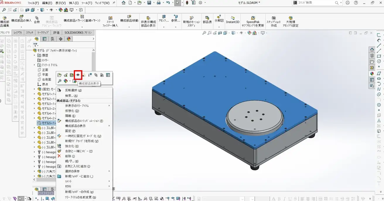 戻し方は、再度ツリー内で非表示になっている部品を右クリック。「構成部品を表示」(斜線の入っていない目のイラスト)をクリックすると部品が表示されます。
