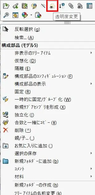 やり方は先程と同様、ツリー内で透明度変更したい部品を右クリック。出てきたメニューの「透明度変更」をクリックします。