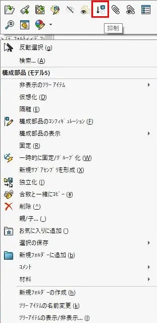 やり方は、ツリー内で抑制したい部品を右クリック。出てきたメニューの「抑制」をクリックします。