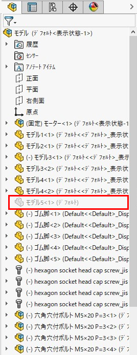 フィーチャーマネージャーデザインツリー内で非表示にしたい部品を右クリック。