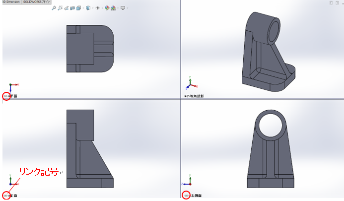 例えば「4面ビュー」を選択すると正面/平面/右側面/不等角投影が同時に表示されます。