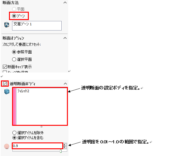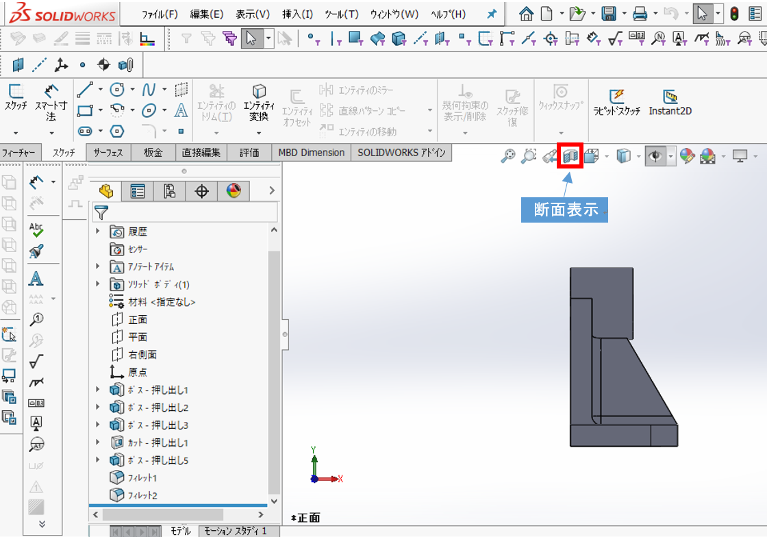断面表示の設定がフィーチャーマネージャー内に出てきます。