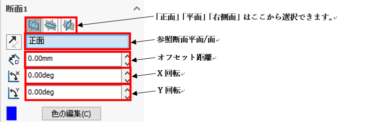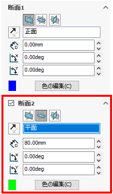 また、オフセット距離、X回転、Y回転に数値を入れて断面を移動させることも可能です。