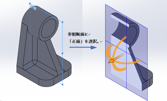 例えば、参照断面平面/面に「正面」を選ぶと「正面」を堺として断面表示されます。
