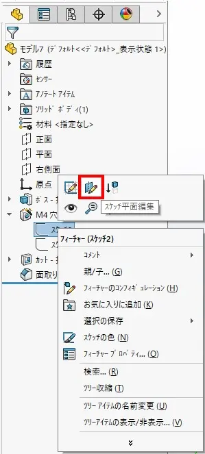 この機能を使えば、スケッチ面を間違えてしまったときに簡単にスケッチ面を変更することが出来ます。